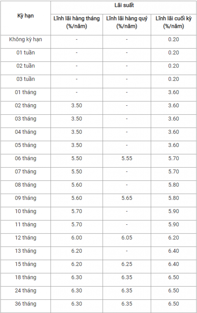 - Lãi suất tiền gửi tại các kỳ hạn từ 1 tháng đến 5 tháng đồng loạt giảm 0,2 điểm % và niêm yết ở mức là 3,6%/năm.