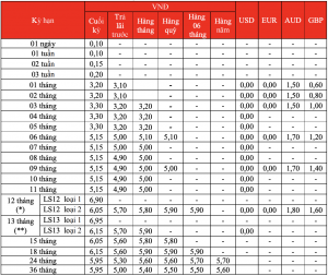 Do đó, khung lãi suất vẫn tiếp tục nằm trong phạm vi từ 3,2%/năm – 6,95%/năm cho các khoản tiền gửi từ 1 đến 36 tháng, lãi trả vào cuối kỳ.