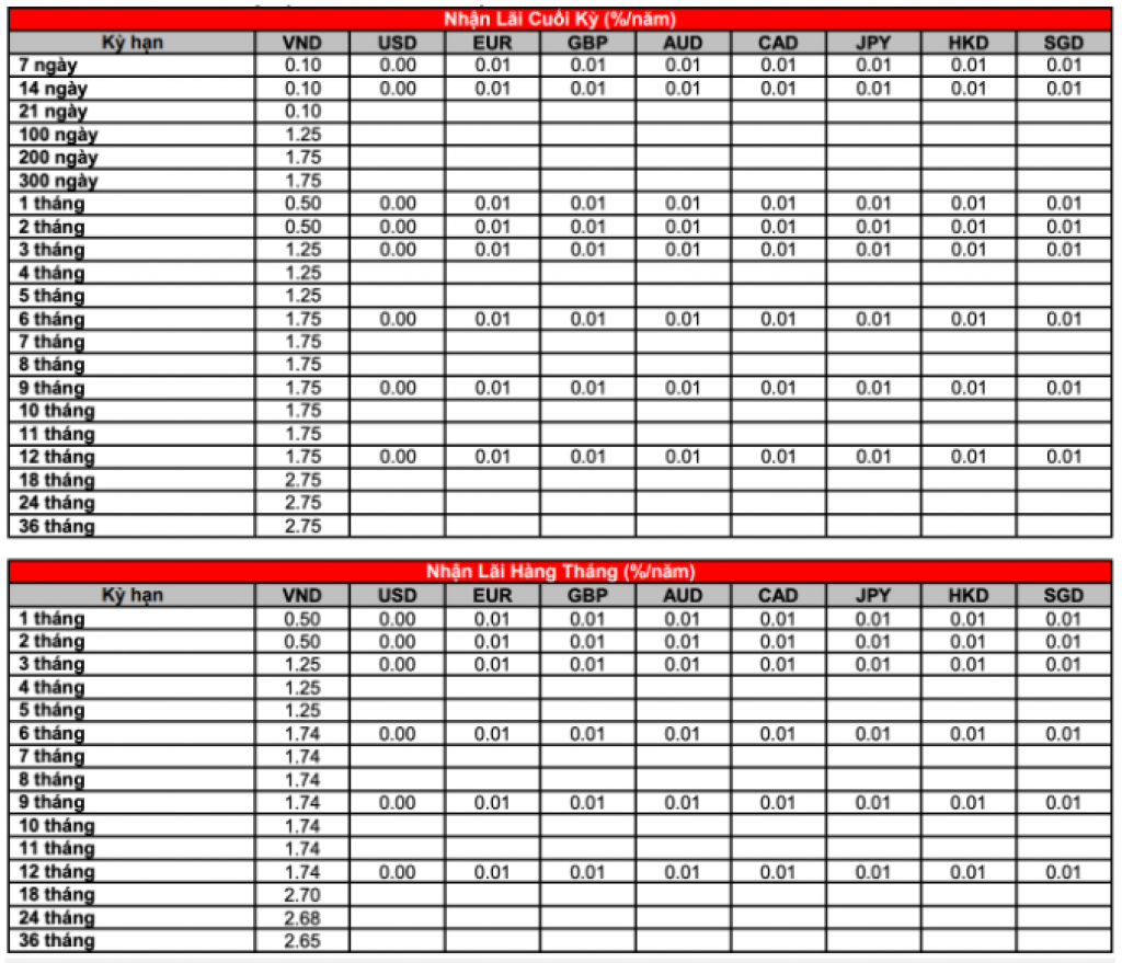 Ngoài ra, ba kỳ hạn tính theo ngày là 100 ngày được niêm yết lãi suất là 1,25%/năm; kỳ hạn 200 và 300 ngày được đồng quy định ở mức là 1,75%/năm.