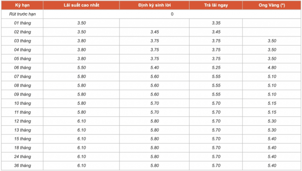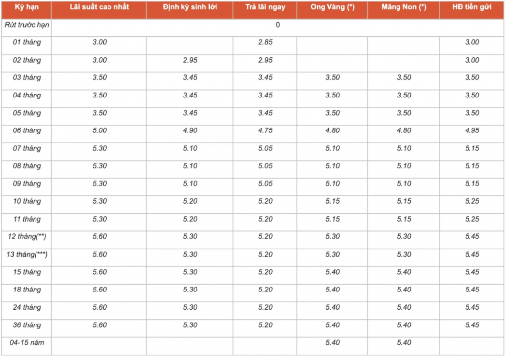 - Kỳ hạn 12 tháng trở lên đến 36 tháng được quy định cùng mức lãi suất là 5,6%/năm, tương ứng mỗi kỳ hạn giảm 0,3% điểm.