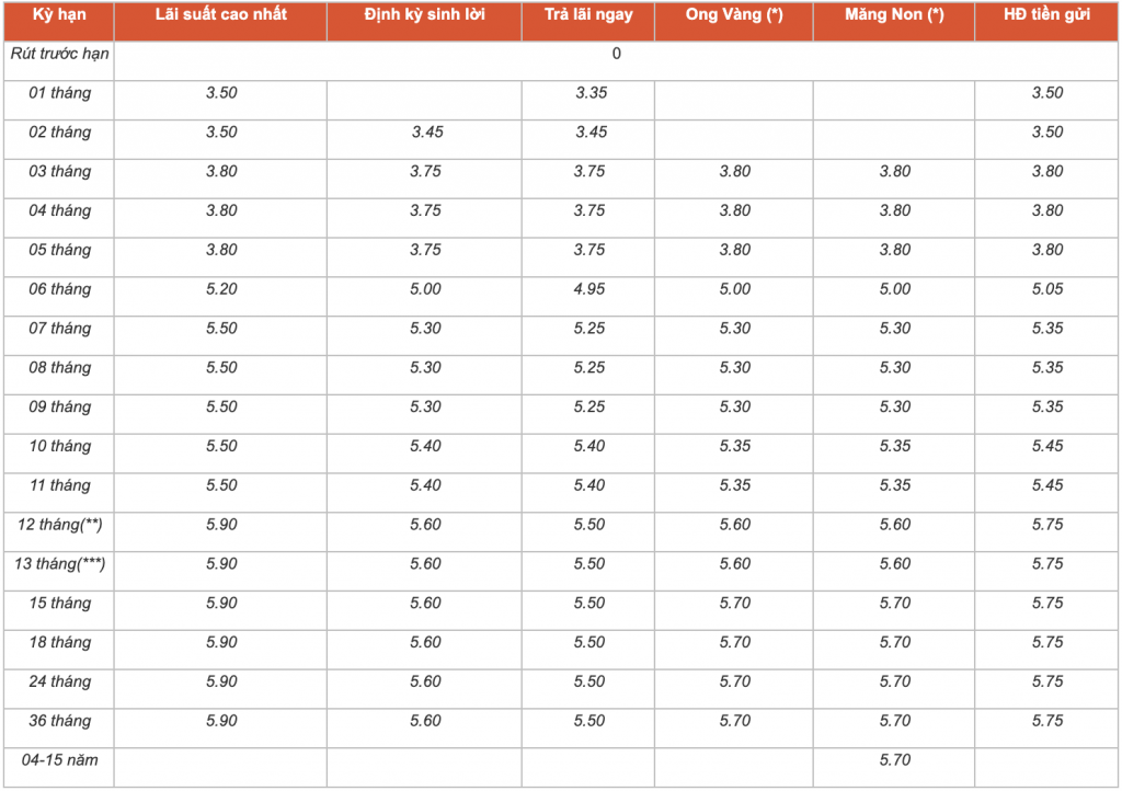 Cụ thể, tất cả các khoản tiết kiệm có kỳ hạn 1 tháng và 2 tháng được huy động với cùng lãi suất là 3,5%/năm. Trường hợp khi khách hàng gửi tiền tiết kiệm tại các kỳ hạn từ 3 tháng đến 5 tháng sẽ được hưởng lãi suất không đổi là 3,8%/năm.