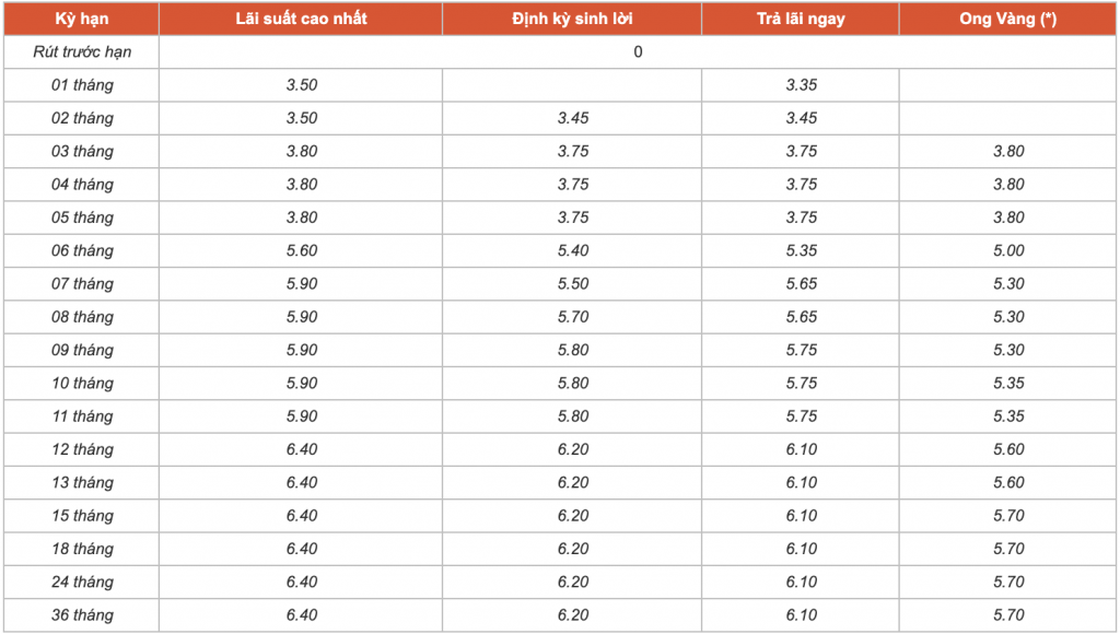 Ngoài ra, lãi suất tiền gửi tiết kiệm từ kỳ hạn 12 tháng trở lên đến 36 tháng được quy định cùng mức lãi suất không đổi là 5,9%/năm.