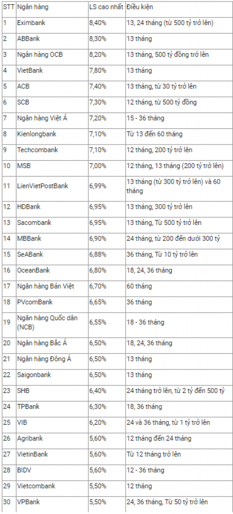 - Eximbank tiếp tục có lãi suất tiền gửi cao nhất ở mức 8,4%/năm, áp dụng cho khách hàng gửi tiết kiệm với số tiền từ 500 tỷ đồng trở lên tại kỳ hạn 13 tháng và 24 tháng.