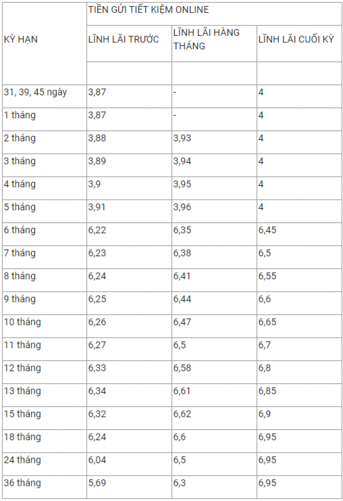 Đặc biệt, khi gửi tiết kiệm online khách hàng sẽ được hưởng lãi suất tiền gửi cao hơn gửi tiết kiệm tại quầy từ 0,05 đến 0,75 điểm % tại hầu hết các kỳ hạn gửi. Biểu lãi suất tiết kiệm online dao động trong phạm vi từ 4%/năm đến 6,95%/năm, lĩnh lãi cuối kỳ. Bên cạnh các kỳ hạn thông thường, hình thức gửi online còn có thêm các kỳ hạn 31, 39 và 45 ngày với lãi suất niêm yết là 4%/năm.