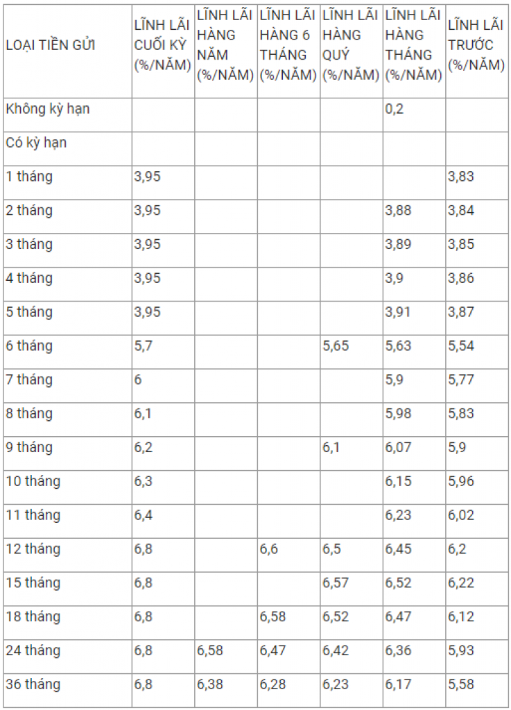 Biểu lãi suất tiền gửi thông thường dành cho khách hàng cá nhân dao động trong khoảng từ 3,95%/năm đến 6,8%/năm, lĩnh lãi cuối kỳ. Thời gian triển khai huy động tiền gửi là từ 1 tháng đến 36 tháng.