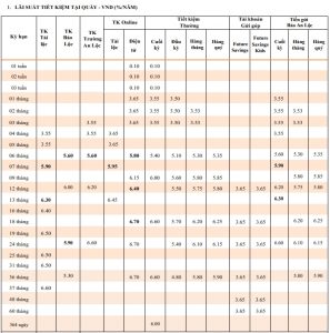 Lãi suất tiết kiệm thường lĩnh lãi cuối kỳ dành cho khách hàng cá nhân được triển khai trong khoảng từ 3,55%/năm đến 6,6%/năm, kỳ hạn áp dụng từ 1 tháng đến 60 tháng.