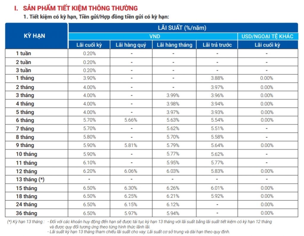 - Kỳ hạn từ 6 tháng đến 36 tháng (trừ kỳ hạn 13 tháng) đồng loạt giảm 0,2 điểm % tại mỗi kỳ hạn.