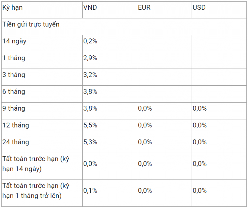 Khách hàng có nhu cầu tất toán trước kỳ hạn sẽ được áp dụng lãi suất 0%/năm tại kỳ hạn 14 ngày và lãi suất 0,2%/năm đối với các kỳ hạn từ 1 tháng trở lên.