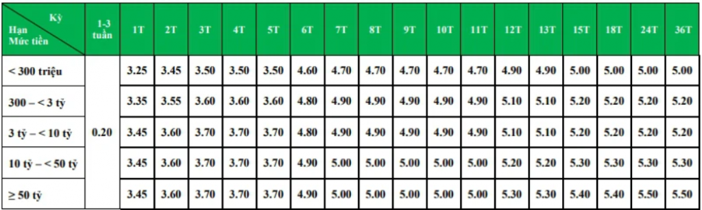 Ngân hàng áp dụng lãi suất 0,2%/năm cho các khoản tiền gửi tại kỳ hạn dưới 1 tháng, không áp dụng đối với Tiền gửi có kỳ hạn lĩnh lãi cuối kỳ.