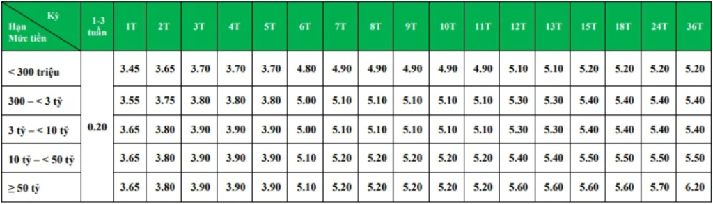 Lãi suất huy động với số tiền gửi từ 3 tỷ đồng đến dưới 10 tỷ có lãi suất từ 3,45%/năm đến 5,2%/năm.