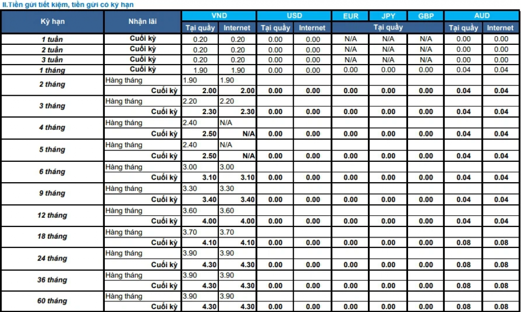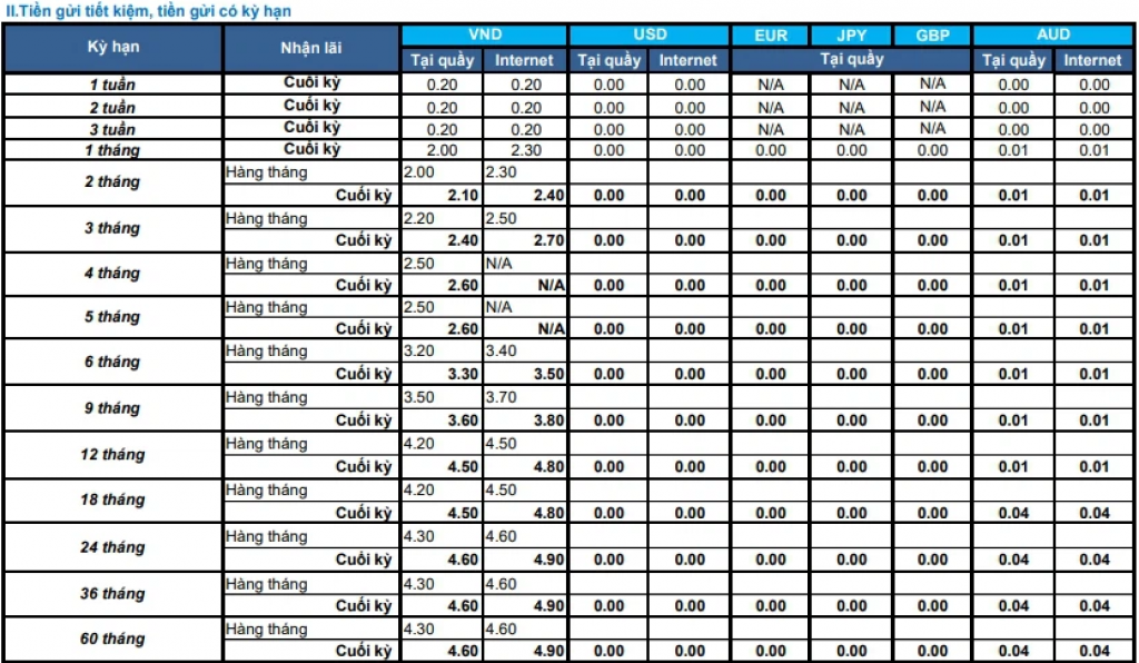 Được duy trì trong khoảng 2%/năm đến 4,6%/năm, lĩnh lãi cuối kỳ. Thời gian huy động vốn từ 1 tháng đến 60 tháng. Với khách hàng gửi tiết kiệm lĩnh lãi hàng tháng, ngân hàng áp dụng lãi suất từ 2%/năm đến 4,3%/năm.