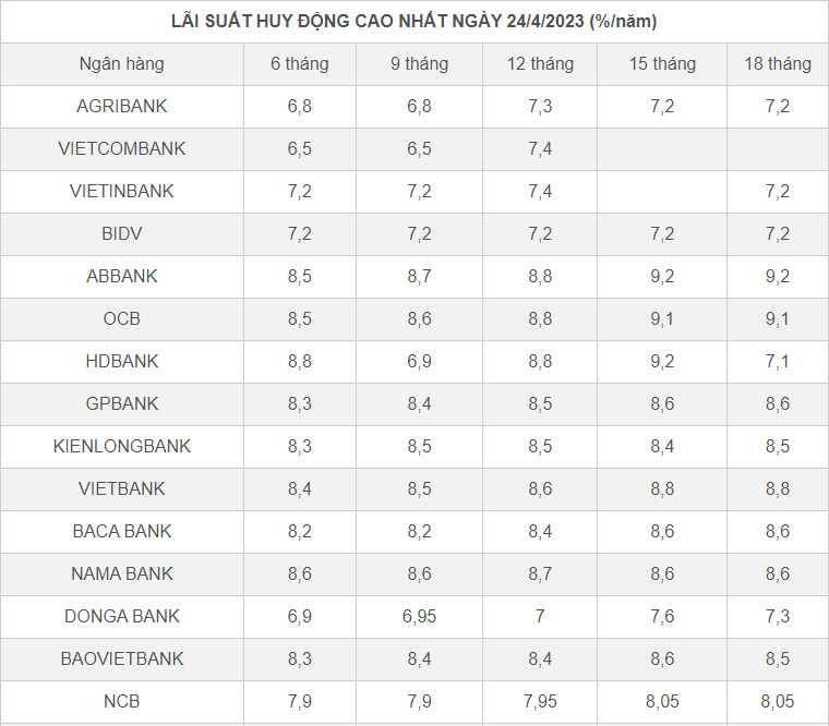 | LÃI SUẤT HUY ĐỘNG CAO NHẤT NGÀY 24/4/2023 (%/năm) | |||||