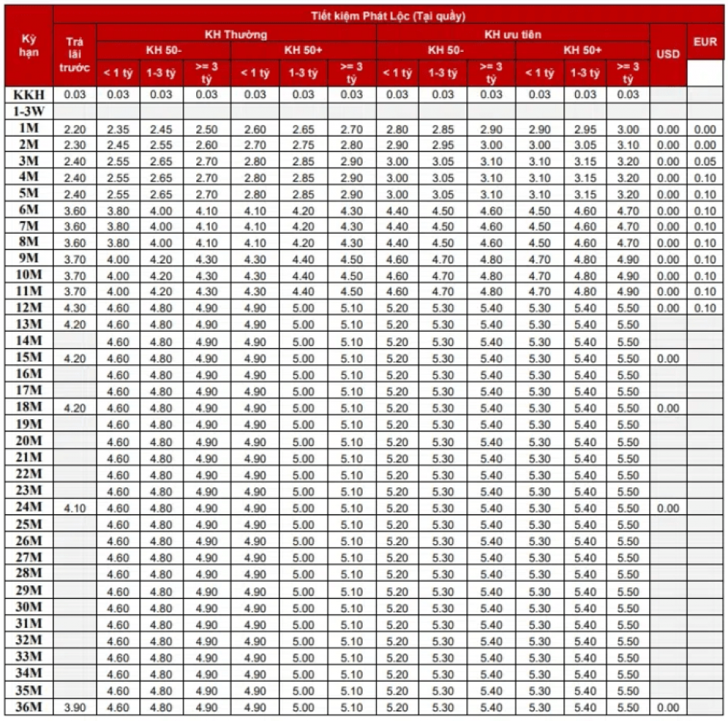 Bên cạnh đó, khách hàng cũng có thể lựa chọn gửi tiền tại sản phẩm Tiết kiệm Phát Lộc, với lãi suất được chia theo khung tiền gửi: dưới 1 tỷ đồng, từ 1 tỷ đến dưới 3 tỷ đồng và từ 3 tỷ đồng trở lên. Đáng chú ý, lãi suất tại sản phẩm này ưu đãi cao hơn so với hình thức gửi tiền thông thường.