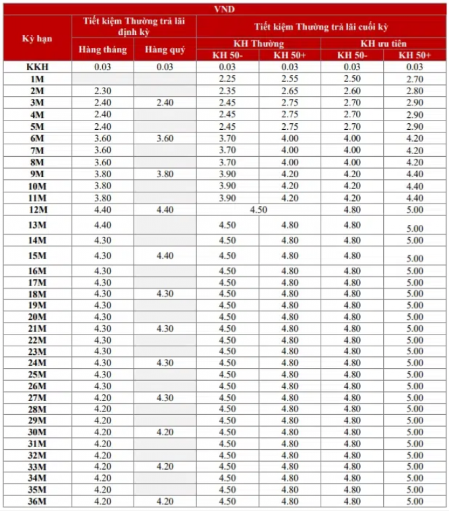 Lãi suất tiết kiệm dành cho các khách hàng trên 50 tuổi cao hơn 0,3 điểm % tại hầu hết các kỳ hạn so với khách hàng dưới 50 tuổi. Riêng tại kỳ hạn 12 tháng, ngân hàng áp dụng cùng mức lãi suất 7,1%/năm (khoản tiền trên 200 tỷ đồng) và 4,6%/năm (dưới 200 tỷ đồng). Biểu lãi suất ngân hàng có phạm vi từ 2,55%/năm đến 4,8%/năm.