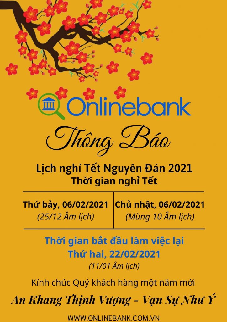 Hoà chung niềm vui mừng năm mới. Onlinebank xin thông báo lịch nghỉ Tết Tân Sửu 2021 của chúng tôi như sau.