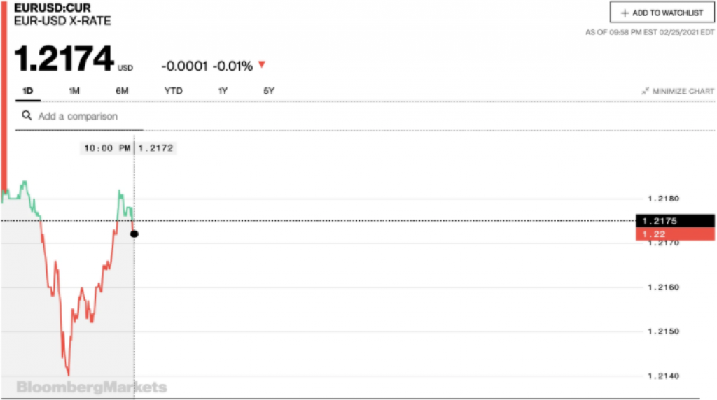 Trên thị trường quốc tế, đồng euro ghi nhận lúc 10h00 giao dịch ở mức 1,2174 USD/EUR, giảm 0,01% so với giá đóng cửa ngày hôm qua (25/2).