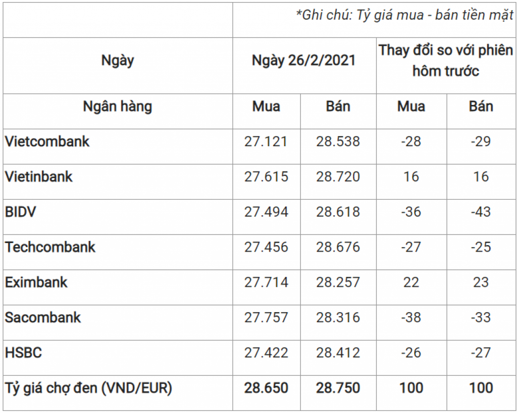 Ghi nhận tỷ giá euro 26/2 được điều chỉnh giảm tại đa số các ngân hàng so với phiên đóng cửa cuối ngày hôm qua. Tại thị trường chợ đen, giá euro ngược lại tăng lên mua – bán ở mức là 28.650 – 28.750 VND/EUR.