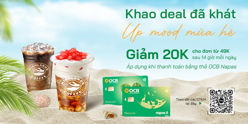 Giảm 20.000 VND cho hóa đơn từ 49.000 VND trở lên khi khách hàng thanh toán trực tiếp (POS) bằng thẻ OCB NAPAS tại hệ thống cửa hàng Highlands Coffee trên toàn quốc sau 14 giờ mỗi ngày.