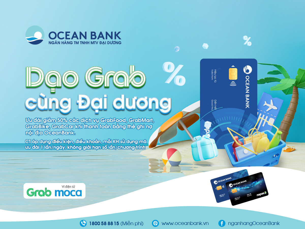 Chủ thẻ ghi nợ nội địa OceanBank được hưởng ưu đãi 50% khi thanh toán dịch vụ tại: GrabFood, GrabMart, GrabCar, GrabBike trên ứng dụng Grab