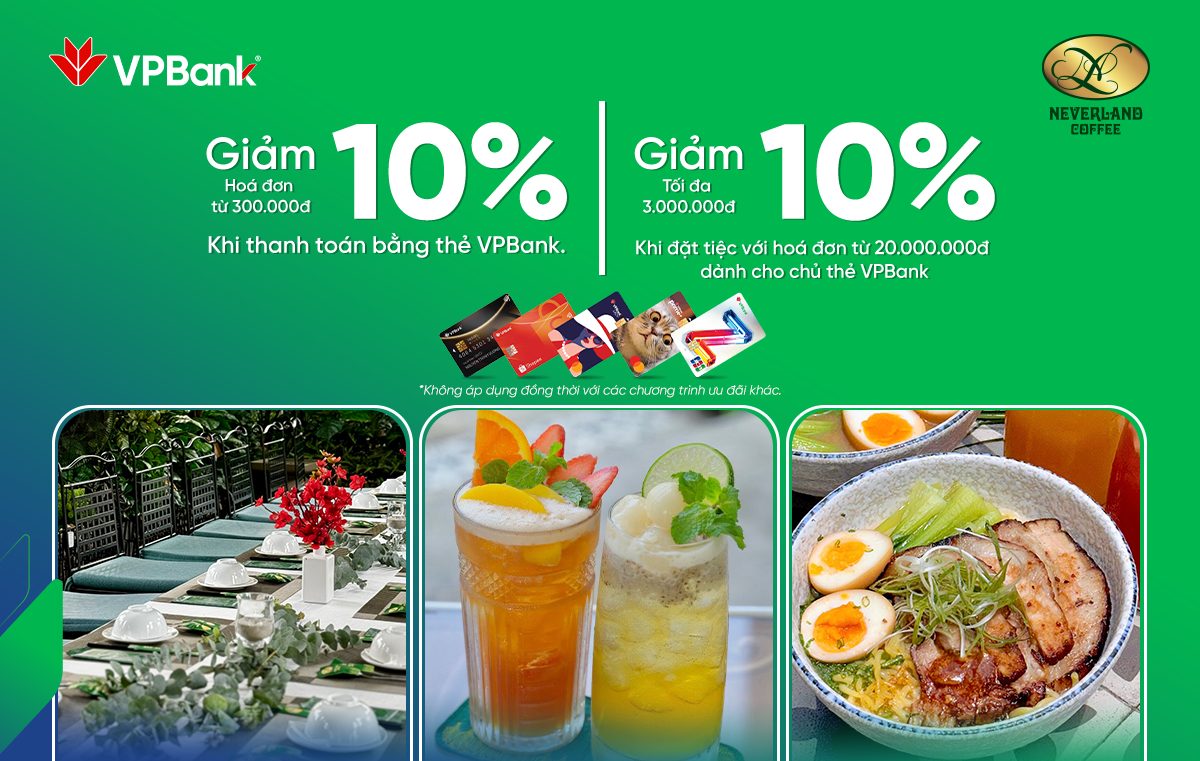Chương trình Ưu đãi giảm 10% chi tiêu thẻ VPBank thưởng thức những bữa ăn “Ngọt ngào” tại Neverland Coffee áp dụng từ ngày 05/09/2024 đến hết ngày 05/03/2025