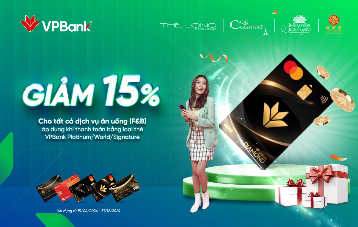 Giảm 15% trước phí phục vụ và thuế GTGT cho tất cả dịch vụ ăn uống (F&B) áp dụng khi thanh toán bằng loại thẻ VPBank Platinum/World/Signature.