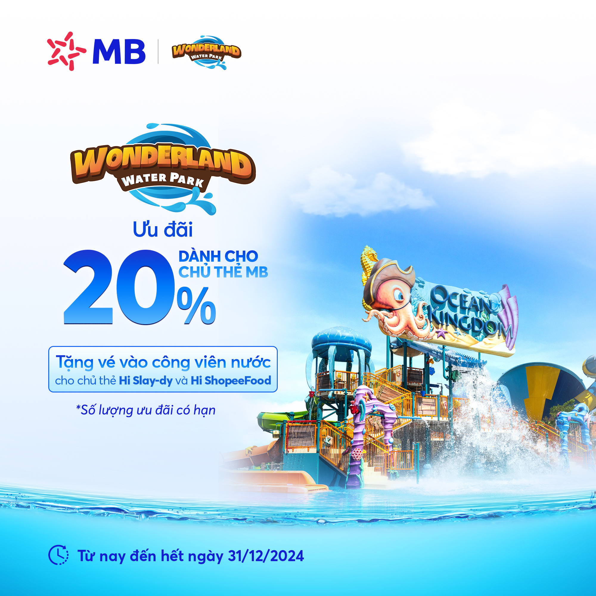 Từ nay đến ngày 31/12/2024, Ngân hàng TMCP Quân Đội (MB) hợp tác cùng Đối tác WONDERLAND WATER PARK mang đến chương trình ưu đãi “Giảm 20% dành cho chủ thẻ MB”.