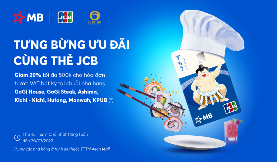 Giảm 20% tối đa 500.000đ cho hóa đơn trước VAT bất kỳ khi KH thanh toán quẹt POS bằng thẻ MB JCB tại hệ thống nhà hàng: GoGi House, GoGi Steak, Ashima, Kichi – Kichi, Hutong, Manwah, KPUB trừ các nhà hàng ở Vinh và thuộc TTTM Aeon Mall.