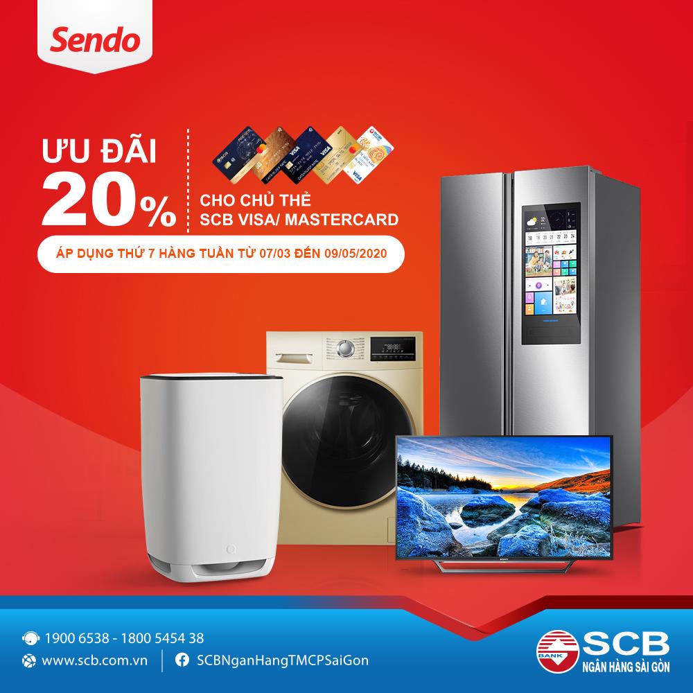 – Khách hàng phải sử dụng Thẻ SCB Visa/ Mastercard (bao gồm cả thẻ tín dụng quốc tế và thẻ ghi nợ quốc tế SCB) tại trang web www.sendo.vn và app Sendo để được hưởng ưu đãi.