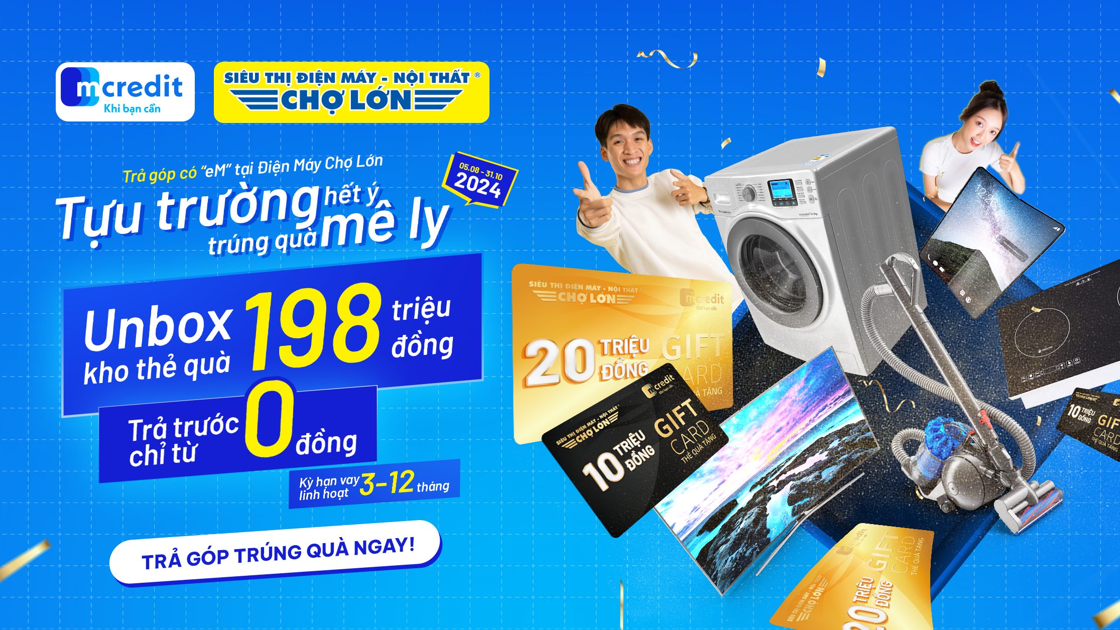 Đến ngay Siêu thị Điện máy – Nội thất Chợ Lớn, chọn trả góp qua Mcredit để sắm sửa hành trang chuẩn bị nhập học đủ đầy và nhận cơ hội trúng thẻ quà tặng “mê ly” tới 20 triệu đồng!