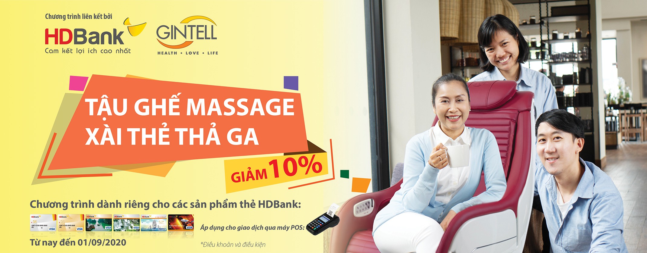 Giảm thêm 10% ngay trên hóa đơn thanh toán dành cho Chủ thẻ HDBank khi Chủ thẻ thanh toán bằng thẻ của HDBank qua máy POS.