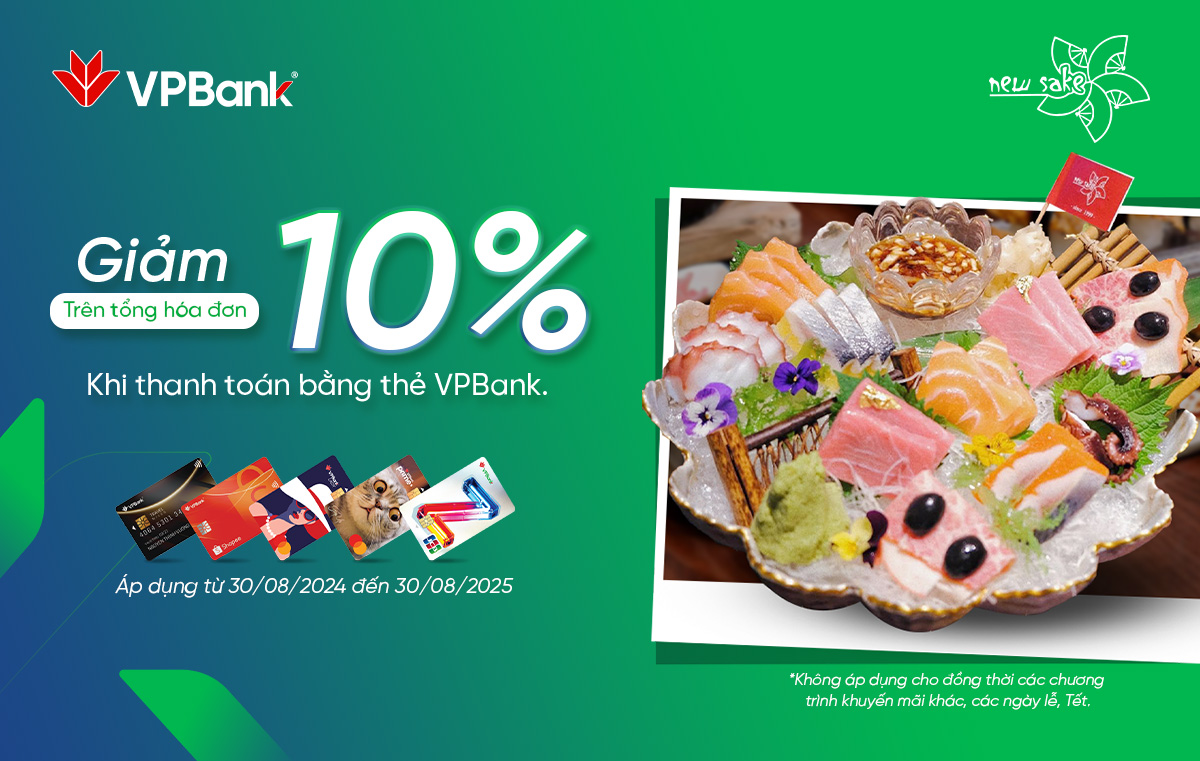 Chương trình hợp tác ưu đãi giảm 10% cho chủ thẻ VPBank tại Nhà Hàng Nhật Bản New Sake được áp dụng từ ngày 31/08/2024 đến ngày 31/08/2025