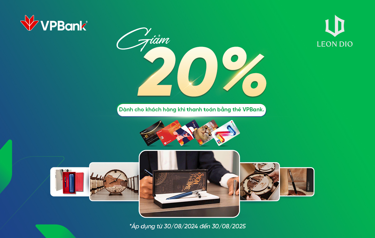 Chương trình Ưu đãi 20% chi tiêu thẻ VPBank cực hấp dẫn tại Bút ký cao cấp Leon Dio được áp dụng từ ngày 30/08/2024 đến ngày 30/08/2025
