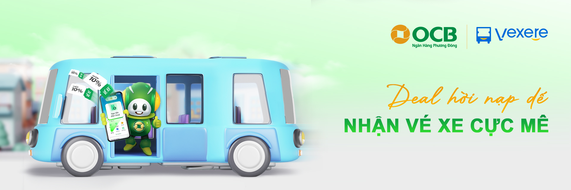 Chương trình Deal Hời Nạp Dế – Nhận Vé Xe Cực Mê, nhận ngay mã giảm 10% cùng Vexere (phiên bản App và Web) cho Khách hàng lần đầu tiên nạp tiền điện thoại từ 50.000 VNĐ trở lên trên ngân hàng số OCB OMNI.